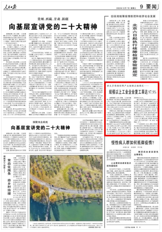 統(tǒng)籌疫情防控和經(jīng)濟社會發(fā)展,重慶精準做好工業(yè)企業(yè)及產(chǎn)業(yè)園區(qū)疫情防控工作,堅持以龍頭骨干企業(yè)為牽引,帶動上下游、產(chǎn)供銷、大中小協(xié)同,保障產(chǎn)業(yè)鏈、供應(yīng)鏈穩(wěn)定。截至12月4日,全市7346家規(guī)模以上工業(yè)企業(yè)中,已復(fù)工6974家,除停產(chǎn)企業(yè)外,復(fù)工率達97.9%,規(guī)模以上工業(yè)企業(yè)返崗員工126.6萬人,返崗率達85.2%。