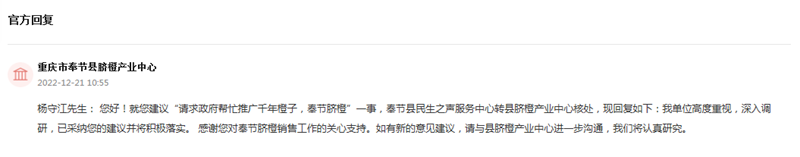 2022年12月21日,奉節(jié)縣臍橙產(chǎn)業(yè)中心對網(wǎng)友留言進行了回復:就您建議“請求政府幫忙推廣千年橙子,奉節(jié)臍橙”一事,已采納建議并將積極落實。人民網(wǎng)在回訪中了解到,奉節(jié)縣臍橙產(chǎn)業(yè)中心已邀請楊守江參加1月6日在渝舉行的第四屆重慶奉節(jié)國際“橙博會”,幫助農(nóng)戶提高臍橙銷售量,擴大奉節(jié)臍橙品牌影響力。