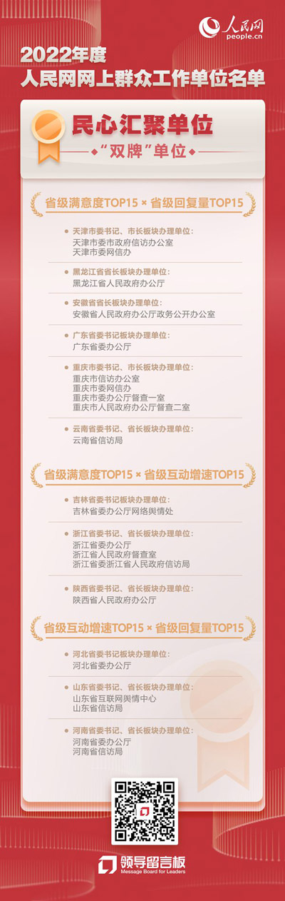 值得點贊的是,重慶市委書記、市長板塊辦理單位(重慶市信訪辦公室、重慶市委網(wǎng)信辦、重慶市委辦公廳督查一室、重慶市人民政府辦公廳督查二室)再次入圍2022年度人民網(wǎng)網(wǎng)上群眾工作民心匯聚單位。