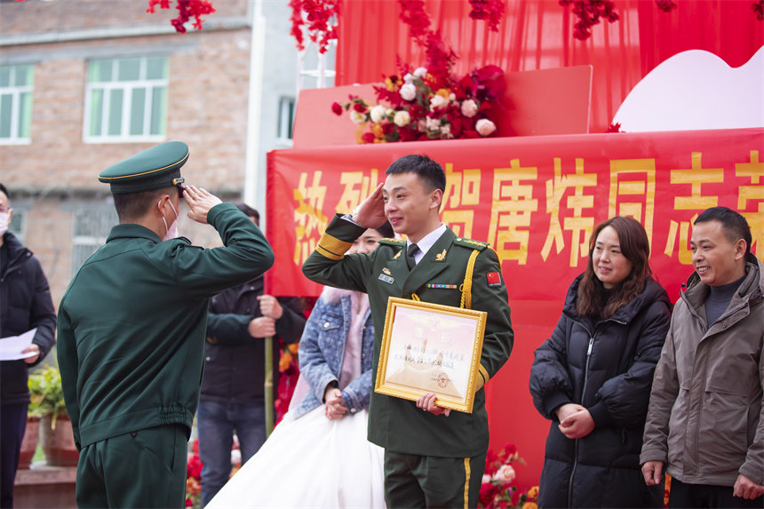 人民網(wǎng)重慶1月20日電 (陳琦、劉祎)1月17日,重慶市開州區(qū)一個(gè)農(nóng)家小院喜氣洋洋。一對(duì)年輕夫妻在農(nóng)家小院舉行婚禮的時(shí)候,收到武警重慶總隊(duì)執(zhí)勤第三支隊(duì)聯(lián)合當(dāng)?shù)赝艘圮娙耸聞?wù)局為新郎唐煒?biāo)腿サ奶厥庑禄椤百R禮”——三等功喜報(bào)。