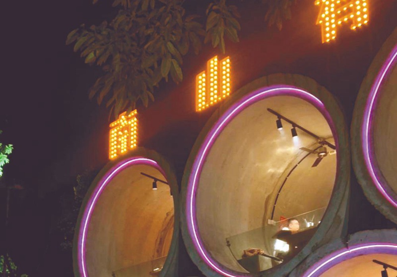 為何會設(shè)計成“水泥管”的造型?烤肉店老板彭女士說,“重慶有句話叫‘我們一起下館子’,我們出于這種想法,才在院內(nèi)設(shè)計了這樣的造型?!彼f,這樣設(shè)計是為了能給客人留下特別的回憶。