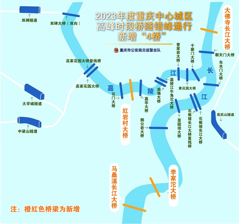 重慶中心城區(qū)高峰時段橋隧錯峰通行范圍新增4座大橋。重慶市公安局交巡警總隊供圖
