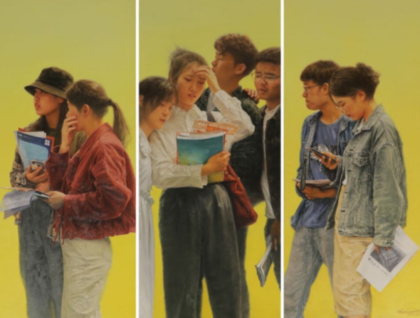《金色的季節(jié)》作品畫面以黃色調(diào)為主,青年學(xué)子成為主角。其作者張宏偉為重慶三峽學(xué)院美術(shù)學(xué)院院長,他回憶,該作品是他在學(xué)校一次招聘會采風時找到的靈感,學(xué)生們朝氣蓬勃、對未來充滿期待的積極狀態(tài)深深打動他。