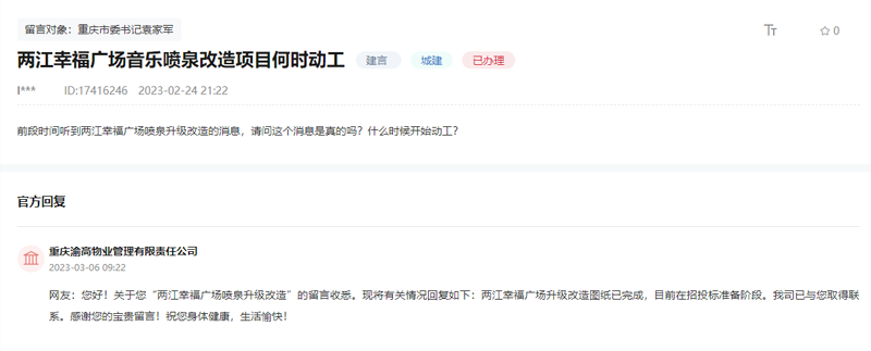 “前段時(shí)間聽到兩江幸福廣場(chǎng)噴泉升級(jí)改造的消息,請(qǐng)問這個(gè)消息是真的嗎?什么時(shí)候動(dòng)工?”群眾留言咨詢。【留言原文鏈接】