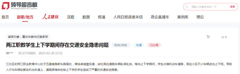 人民網(wǎng)重慶4月11日電 (陳琦)“建議結(jié)合小學(xué)生過馬路時(shí)間,適當(dāng)延長綠燈時(shí)長?!薄皩W(xué)校周邊車輛亂停亂放,給學(xué)生上下學(xué)造成交通安全隱患,盼整治?!苯?,有群眾通過人民網(wǎng)“領(lǐng)導(dǎo)留言板”反映校園周邊交通隱患問題,得到重慶相關(guān)部門的及時(shí)整改和治理。