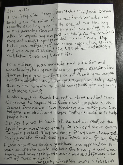 人民網(wǎng)重慶5月18日電 (陳琦、劉祎)“請你給孩子取一個中國名字吧!”5月16日,在巴布亞新幾內(nèi)亞莫港總醫(yī)院,援巴布亞新幾內(nèi)亞中國醫(yī)療隊(以下簡稱“援巴新醫(yī)療隊”)副隊長、重醫(yī)附屬兒童醫(yī)院新生兒科副主任醫(yī)師劉振球收到當(dāng)?shù)鼐用駟躺?伊奈皮的感謝信,信中,喬瑟菲提出了這樣一個要求。這是怎么回事?