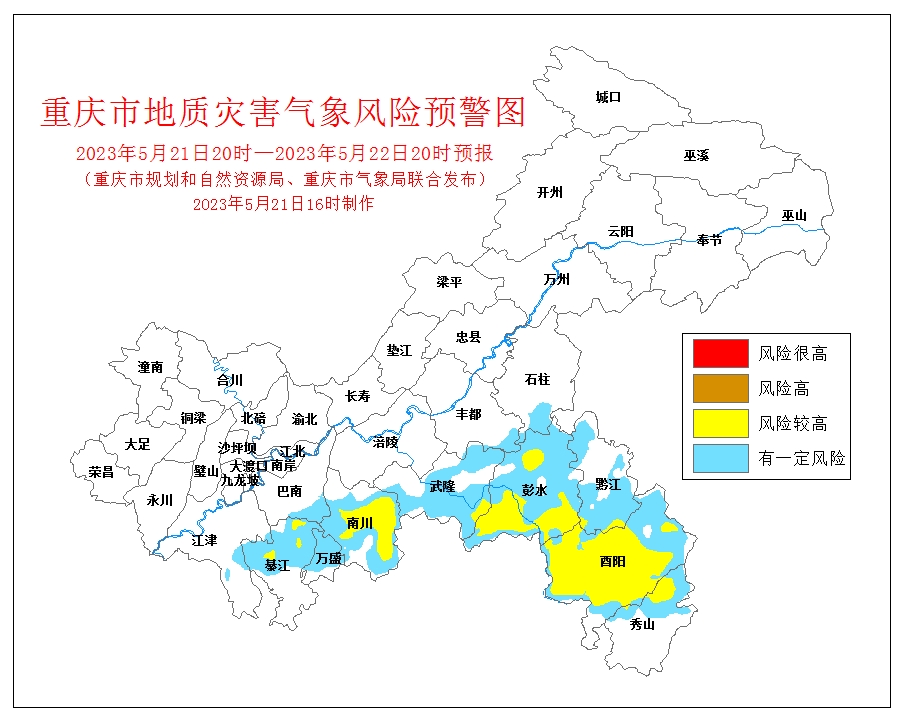 5月21日16時,重慶市規(guī)劃和自然資源局、重慶市氣象局聯(lián)合發(fā)布全市地質災害氣象風險預警。