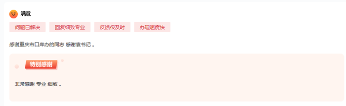 “非常感謝,問題已得到解決,回復(fù)很細(xì)致專業(yè)!”得到留言答復(fù)后,該網(wǎng)友通過人民網(wǎng)“領(lǐng)導(dǎo)留言板”評(píng)價(jià),回復(fù)群眾問題,內(nèi)容詳實(shí)周全,并對重慶市政府口岸物流辦的同志表示感謝。