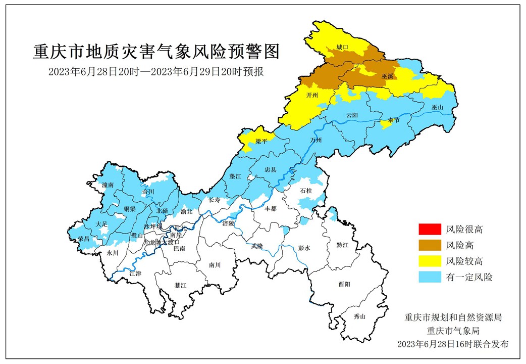6月28日16時(shí),重慶市規(guī)劃和自然資源局、重慶市氣象局聯(lián)合發(fā)布全市地質(zhì)災(zāi)害氣象風(fēng)險(xiǎn)預(yù)警。