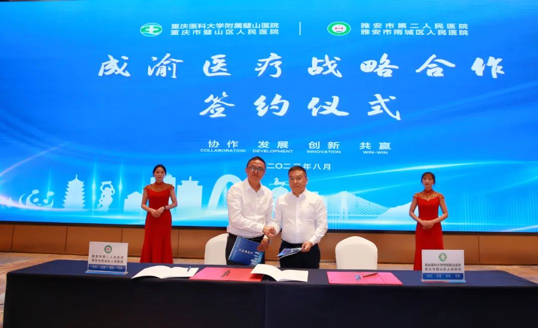 8月25日,重慶醫(yī)科大學附屬璧山醫(yī)院(重慶市璧山區(qū)人民醫(yī)院)與四川省雅安市第二人民醫(yī)院(四川省雅安市雨城區(qū)人民醫(yī)院)在雅安舉行成渝醫(yī)療戰(zhàn)略合作簽約儀式。