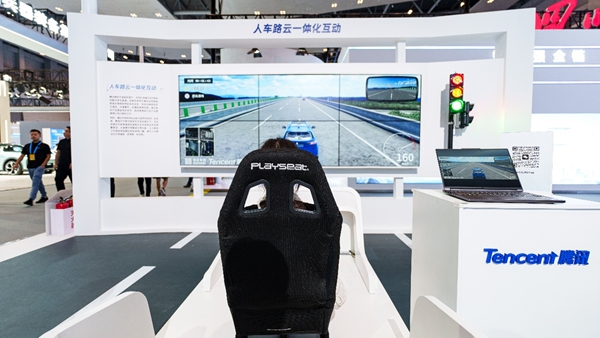 2023智博會(huì)騰訊展區(qū)“人車路云一體化互動(dòng)”體驗(yàn)現(xiàn)場(chǎng)。騰訊供圖