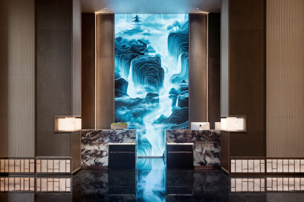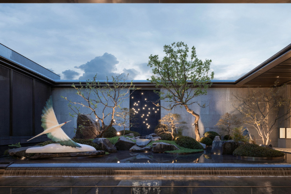 緩步約32米長(zhǎng)廊,入畫(huà)琉璃水院仰觀6米疊瀑,以石造山,以水?dāng)M池,以國(guó)風(fēng)之禮迎賓。此外,示范區(qū)內(nèi)盆景檐口,采用唐代古法制金技藝手工鍛打錘紋,形成108個(gè)精工金屬折邊流水口定制琉璃宮燈,燈影間描摹當(dāng)代奢境。