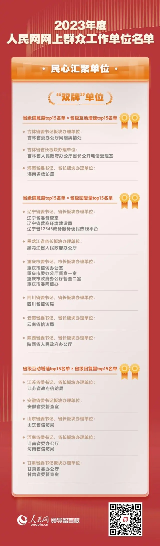 據(jù)悉,此次公布的名單綜合全國各地區(qū)各部門各單位近一年來的滿意度、互動增速、回復(fù)量等指數(shù),著重突出各地區(qū)各部門各單位依托人民網(wǎng)“領(lǐng)導(dǎo)留言板”開展網(wǎng)上群眾工作情況,選出2023年度人民網(wǎng)網(wǎng)上群眾工作“民心匯聚單位”“實(shí)干擔(dān)當(dāng)單位”“匯智為民單位”和“活力奮進(jìn)單位”,共600余家。