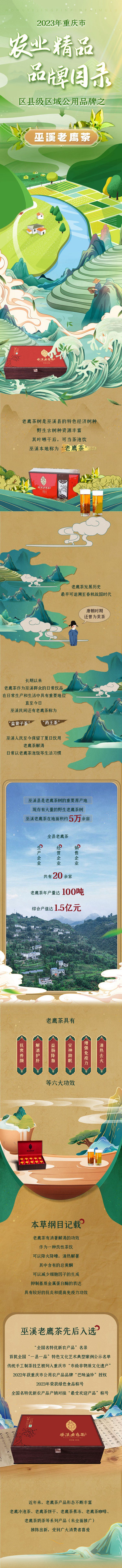 近日,重慶市農(nóng)業(yè)農(nóng)村委發(fā)布《2023重慶農(nóng)業(yè)精品品牌目錄》(以下簡稱《目錄》),經(jīng)過資格審核、專家評審等評選環(huán)節(jié),共有64個品牌入選。本次發(fā)布的《目錄》包含“巴味渝珍”“三峽柑橘”兩個重慶市級區(qū)域公用品牌,萬州玫瑰香橙、涪陵榨菜、趕水草蔸蘿卜、放牛坪梨等28個區(qū)縣級區(qū)域公用品牌,樹上鮮花椒油、魚泉榨菜、井谷元重慶二兩小面、陳昌銀麻花等34個企業(yè)產(chǎn)品品牌,集中呈現(xiàn)了重慶市農(nóng)業(yè)品牌建設(shè)的豐碩成果。本文將帶你詳細(xì)了解入選《目錄》區(qū)縣級區(qū)域公用品牌的巫溪老鷹茶。