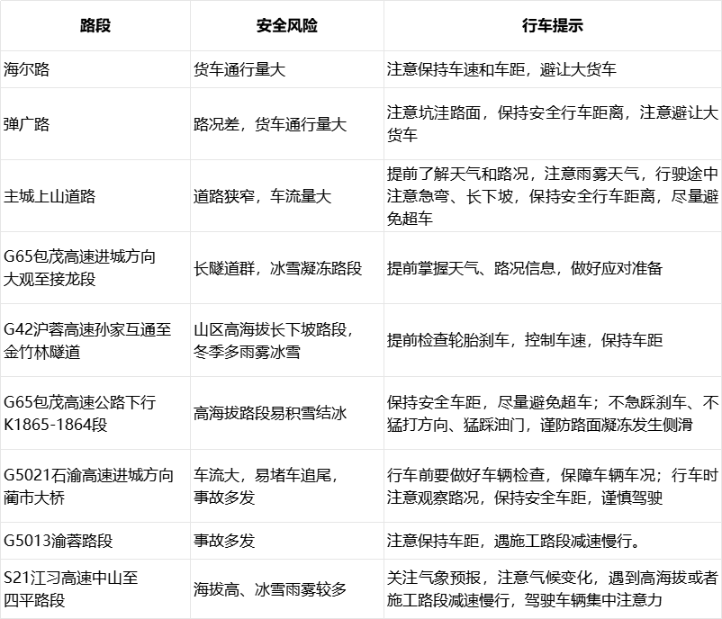 今年春運(yùn)期間,重慶市交通運(yùn)輸綜合行政執(zhí)法總隊(duì)結(jié)合近三年事故多發(fā)路段和春運(yùn)期間低溫雨霧等天氣情況,梳理轄區(qū)安全風(fēng)險(xiǎn)路段,提醒運(yùn)輸企業(yè)及運(yùn)營(yíng)駕駛員提前做好相關(guān)應(yīng)對(duì)準(zhǔn)備。