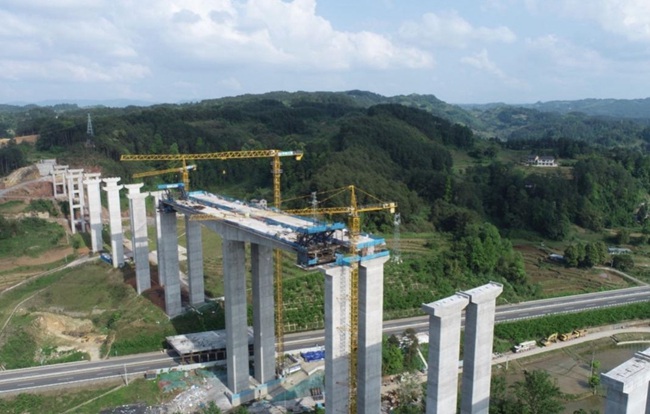 下柏樹灣大橋是武兩高速全線重點(diǎn)控制性工程之一,大橋位于重慶涪陵區(qū)龍?zhí)舵?zhèn)下柏樹灣,由中鐵二院設(shè)計(jì)、中鐵六局太原公司承建。大橋全長(zhǎng)701米,共有17跨,跨越馬龍路、S102省道及龍?zhí)逗樱峡缧问綖?×65mT型剛構(gòu)箱梁,最大墩高78米。