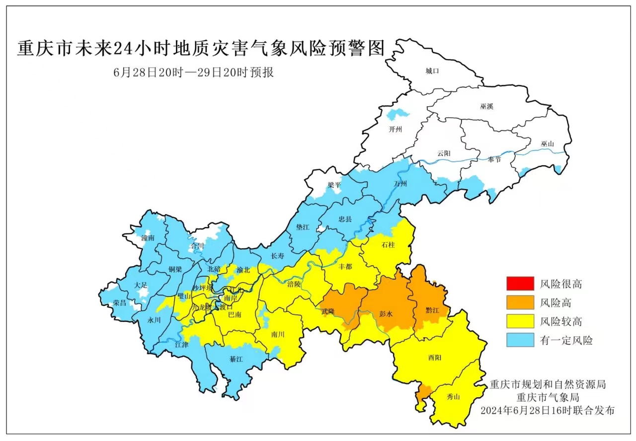 6月28日16時(shí),重慶市規(guī)劃和自然資源局、重慶市氣象局聯(lián)合發(fā)布全市地質(zhì)災(zāi)害氣象風(fēng)險(xiǎn)預(yù)警。