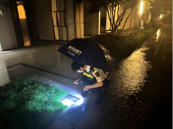 在暴雨中,巴南區(qū)觀山御璟項目新希望服務(wù)秩序員巡查排水設(shè)施。新希望物業(yè)供圖