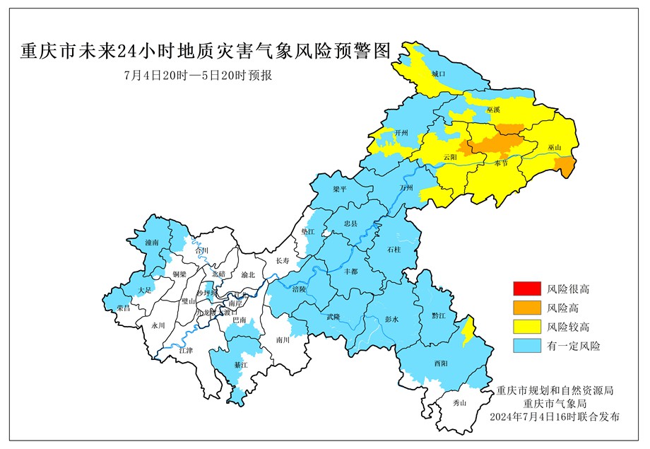7月4日20時(shí)至7月5日20時(shí),巫山縣、巫溪縣、奉節(jié)縣、云陽縣屬于風(fēng)險(xiǎn)高地區(qū),地質(zhì)災(zāi)害氣象風(fēng)險(xiǎn)等級(jí)為II級(jí)(橙色預(yù)警),城口縣、開州區(qū)、萬州區(qū)、酉陽縣屬于風(fēng)險(xiǎn)較高地區(qū),地質(zhì)災(zāi)害氣象風(fēng)險(xiǎn)等級(jí)為III級(jí)(黃色預(yù)警),石柱縣、豐都縣、忠縣、涪陵區(qū)、長壽區(qū)、墊江縣、梁平區(qū)、綦江區(qū)、萬盛經(jīng)開區(qū)、南川區(qū)、武隆區(qū)、彭水縣、黔江區(qū)、秀山縣、潼南區(qū)、大足區(qū)、榮昌區(qū)、銅梁區(qū)、合川區(qū)、巴南區(qū)、重慶高新區(qū)、沙坪壩區(qū)屬于有一定風(fēng)險(xiǎn)地區(qū),地質(zhì)災(zāi)害氣象風(fēng)險(xiǎn)等級(jí)為IV級(jí)(藍(lán)色預(yù)警)。