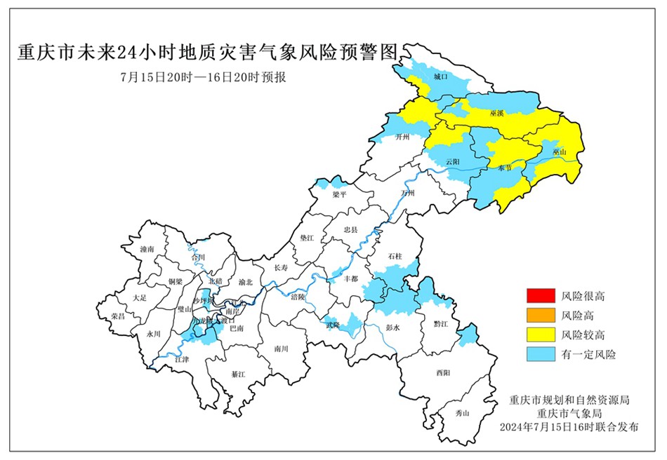 7月15日16時(shí),重慶市規(guī)劃和自然資源局、重慶市氣象局聯(lián)合發(fā)布全市地質(zhì)災(zāi)害氣象風(fēng)險(xiǎn)預(yù)警。