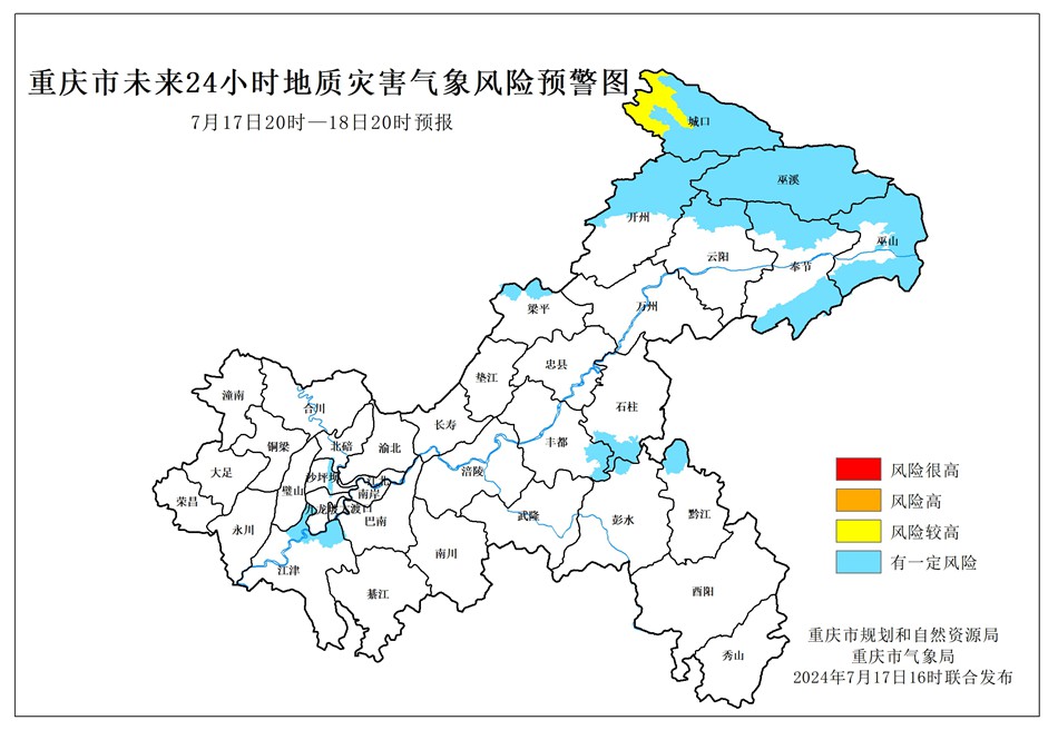 7月17日16時(shí),重慶市規(guī)劃和自然資源局、重慶市氣象局聯(lián)合發(fā)布全市地質(zhì)災(zāi)害氣象風(fēng)險(xiǎn)預(yù)警。