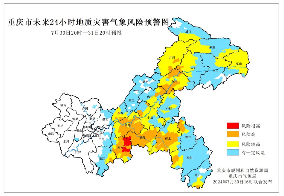 7月30日20時至7月31日20時,南川區(qū)、武隆區(qū)屬于風(fēng)險很高地區(qū),地質(zhì)災(zāi)害氣象風(fēng)險等級為I級(紅色預(yù)警),云陽縣、開州區(qū)、萬州區(qū)、石柱縣、豐都縣、忠縣、涪陵區(qū)、長壽區(qū)、萬盛經(jīng)開區(qū)、彭水縣、黔江區(qū)、酉陽縣、秀山縣屬于風(fēng)險高地區(qū),地質(zhì)災(zāi)害氣象風(fēng)險等級為II級(橙色預(yù)警),城口縣、巫山縣、巫溪縣、奉節(jié)縣屬于風(fēng)險較高地區(qū),地質(zhì)災(zāi)害氣象風(fēng)險等級為III級(黃色預(yù)警),綦江區(qū)、墊江縣、梁平區(qū)、璧山區(qū)、合川區(qū)、巴南區(qū)、渝北區(qū)屬于有一定風(fēng)險地區(qū),地質(zhì)災(zāi)害氣象風(fēng)險等級為IV級(藍(lán)色預(yù)警)。