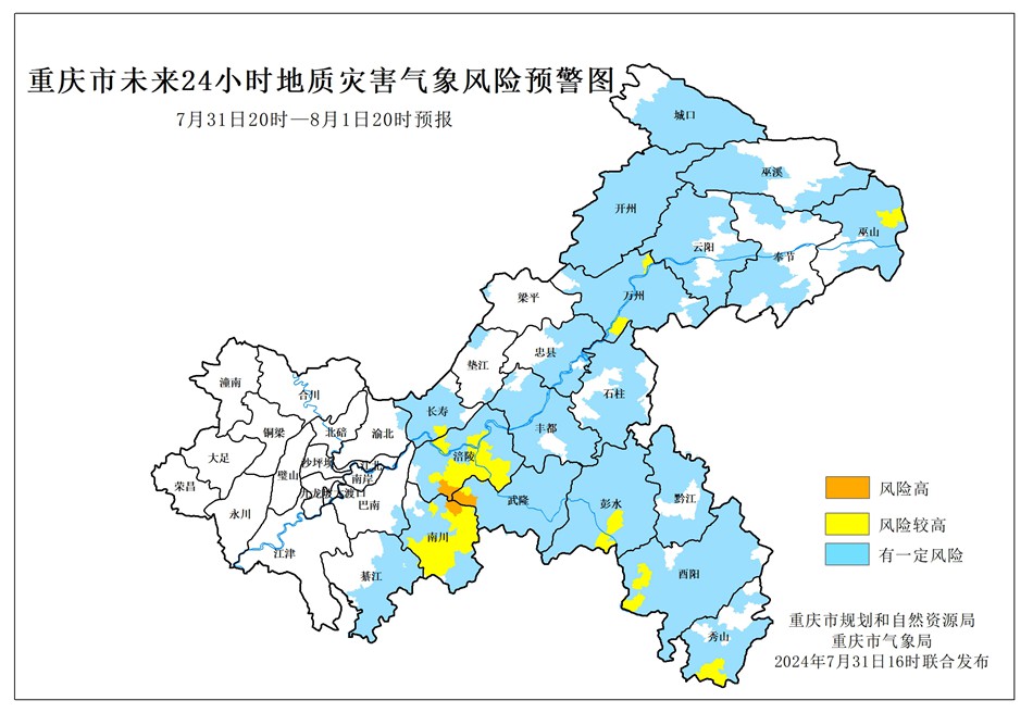 7月31日20時至8月1日20時,涪陵區(qū)、南川區(qū)、武隆區(qū)屬于風(fēng)險高地區(qū),地質(zhì)災(zāi)害氣象風(fēng)險等級為II級(橙色預(yù)警),巫山縣、萬州區(qū)、長壽區(qū)、彭水縣、酉陽縣、秀山縣屬于風(fēng)險較高地區(qū),地質(zhì)災(zāi)害氣象風(fēng)險等級為III級(黃色預(yù)警),城口縣、巫溪縣、奉節(jié)縣、云陽縣、開州區(qū)、石柱縣、豐都縣、忠縣、墊江縣、梁平區(qū)、綦江區(qū)、萬盛經(jīng)開區(qū)、黔江區(qū)、巴南區(qū)、渝北區(qū)屬于有一定風(fēng)險地區(qū),地質(zhì)災(zāi)害氣象風(fēng)險等級為IV級(藍色預(yù)警),請相關(guān)單位注意防范。