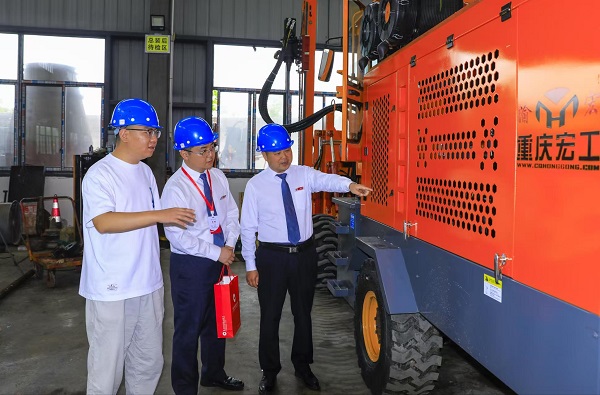 重慶農(nóng)商行梁平支行銀桂分理處主任唐波林(右一)與客戶經(jīng)理張楠(右二)到重慶宏工工程機械股份有限公司走訪,與該公司副總經(jīng)理劉治懋(左一)溝通交流。重慶農(nóng)商行供圖