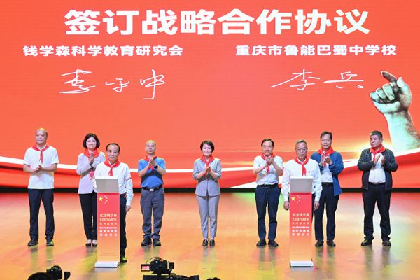 活動中,錢學森科學教育研究會為魯能巴蜀中學授予“錢學森科學教育研究會重慶基地”,并簽訂戰(zhàn)略合作協(xié)議。錢學森科學教育研究會名譽會長、上海交大錢學森圖書館館長錢永剛代表研究會向學校錢學森科學館捐贈“兩彈一星”元勛、中國探月工程總設計師孫家棟手模。錢學森科學教育研究會會長李平中宣讀航天英雄楊利偉賀信,寄語青少年們以錢學森為榜樣,追逐航天夢想。