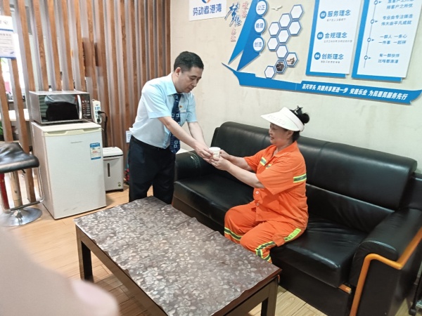 萬(wàn)州百安支行“勞動(dòng)者港灣”為環(huán)衛(wèi)工人提供飲水。建行重慶市分行供圖