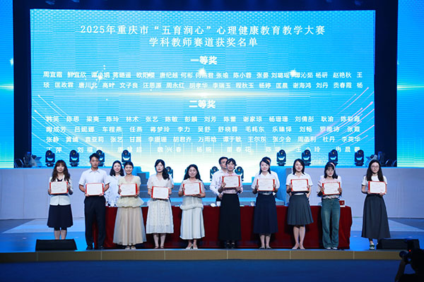 開幕式上通報(bào)了2025年重慶市“五育潤心”心理健康教育教學(xué)大賽評(píng)選結(jié)果,為獲獎(jiǎng)的心理健康教師、班主任、學(xué)科教師代表頒獎(jiǎng)。
