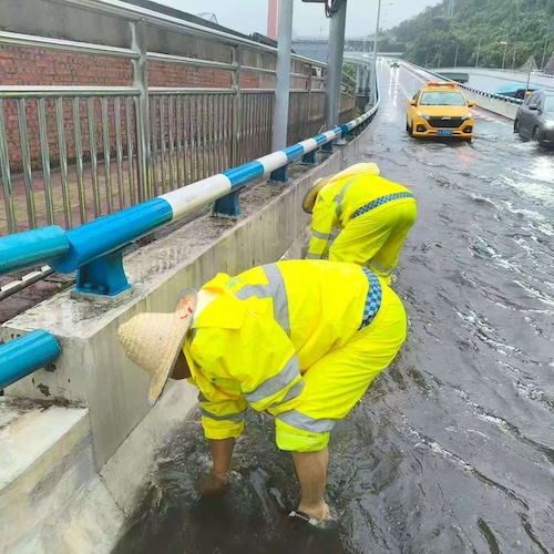 當日上午10時許,江北區(qū)軌道交通寸灘站1A出口登康公司附近,數(shù)名排水人員正在清理沿路雨水篦子,加固防汛擋板;渝北區(qū)雙鳳橋街道,重慶市新超力軸承有限公司附近路段的易澇點,拉起了警戒線;北碚區(qū)縉云幼兒園周邊,管網(wǎng)公司工作人員正揭開水篦子和井蓋,清掏淤堵物,確保排水暢通。