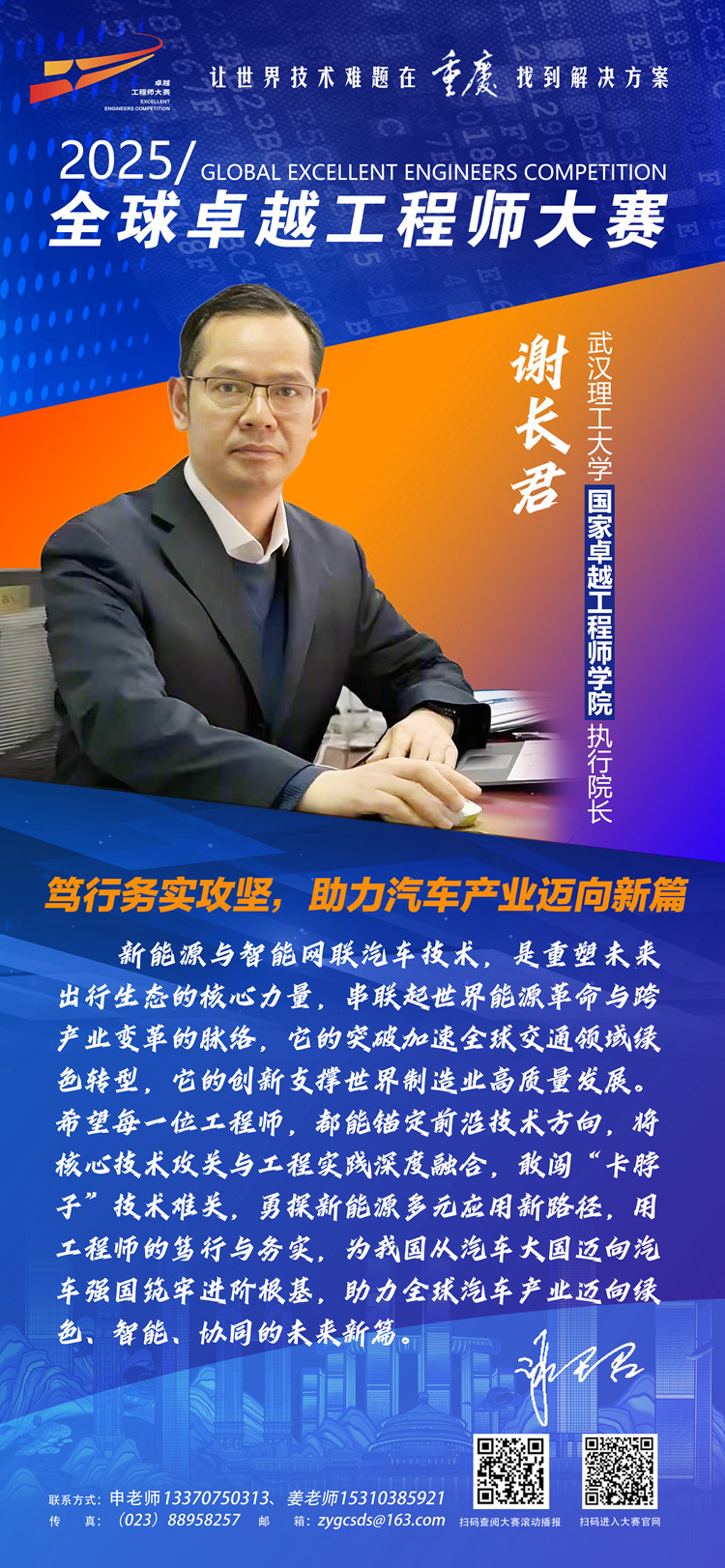 10月10日,武漢理工大學(xué)國家卓越工程師學(xué)院執(zhí)行院長謝長君向全球卓越工程師大賽·2025年度發(fā)來推介詞:新能源與智能網(wǎng)聯(lián)汽車技術(shù),是重塑未來出行生態(tài)的核心力量,串聯(lián)起世界能源革命與跨產(chǎn)業(yè)變革的脈絡(luò),它的突破加速全球交通領(lǐng)域綠色轉(zhuǎn)型,它的創(chuàng)新支撐世界制造業(yè)高質(zhì)量發(fā)展。希望每一位工程師,都能錨定前沿技術(shù)方向,將核心技術(shù)攻關(guān)與工程實踐深度融合,敢闖“卡脖子”技術(shù)難關(guān),勇探新能源多元應(yīng)用新路徑,用工程師的篤行與務(wù)實,為我國從汽車大國邁向汽車強國筑牢進階根基,助力全球汽車產(chǎn)業(yè)邁向綠色、智能、協(xié)同的未來新篇。
