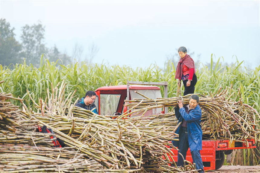 12月2日,開州區(qū)南門鎮(zhèn)萬里村,農(nóng)民將集中砍收的甘蔗運(yùn)出田地。